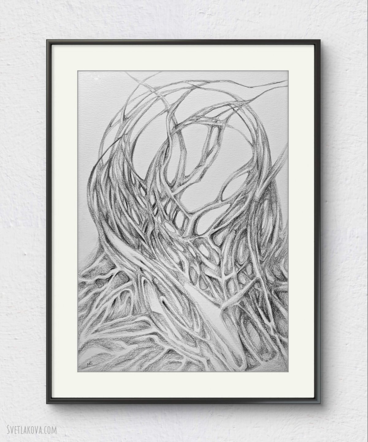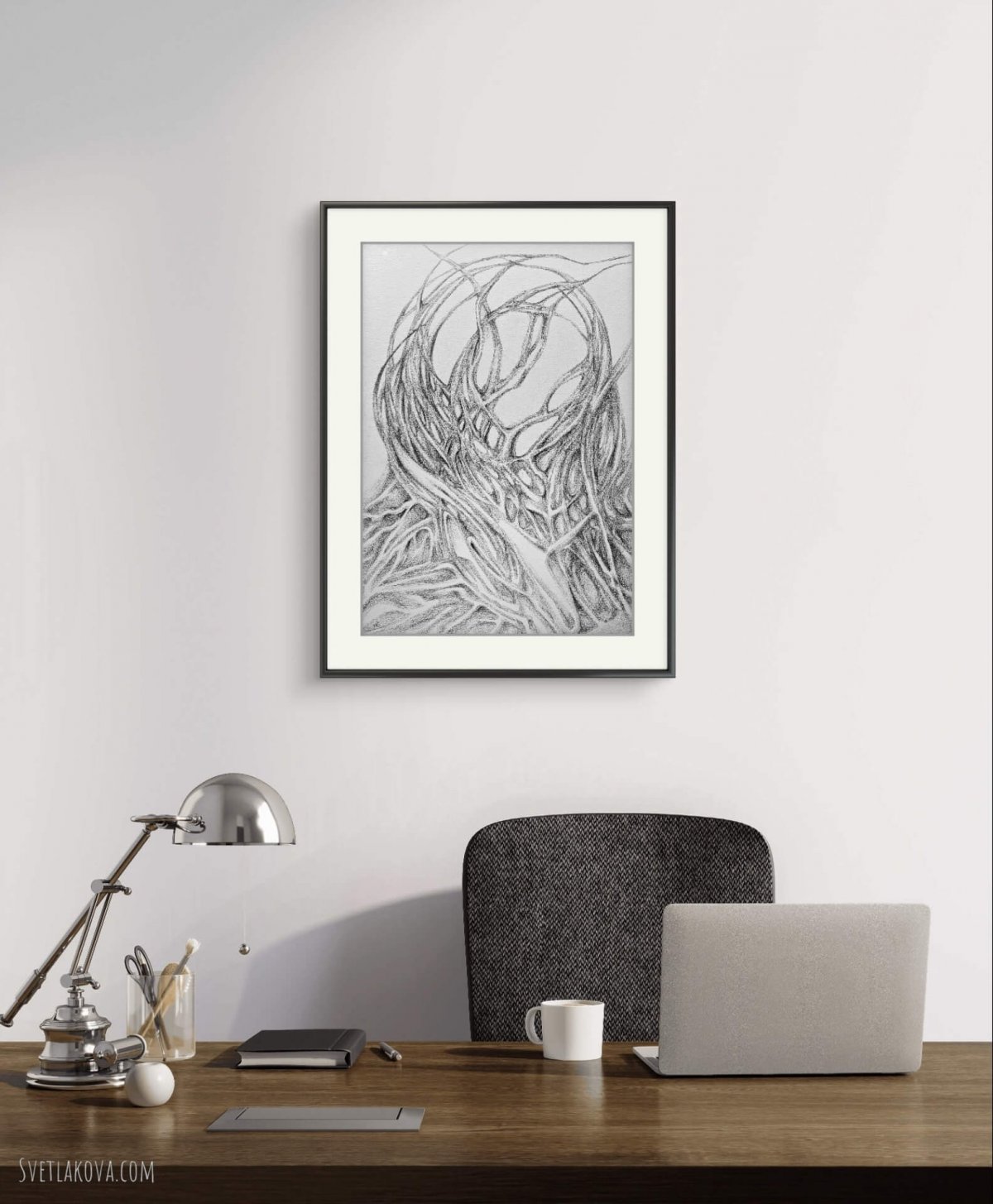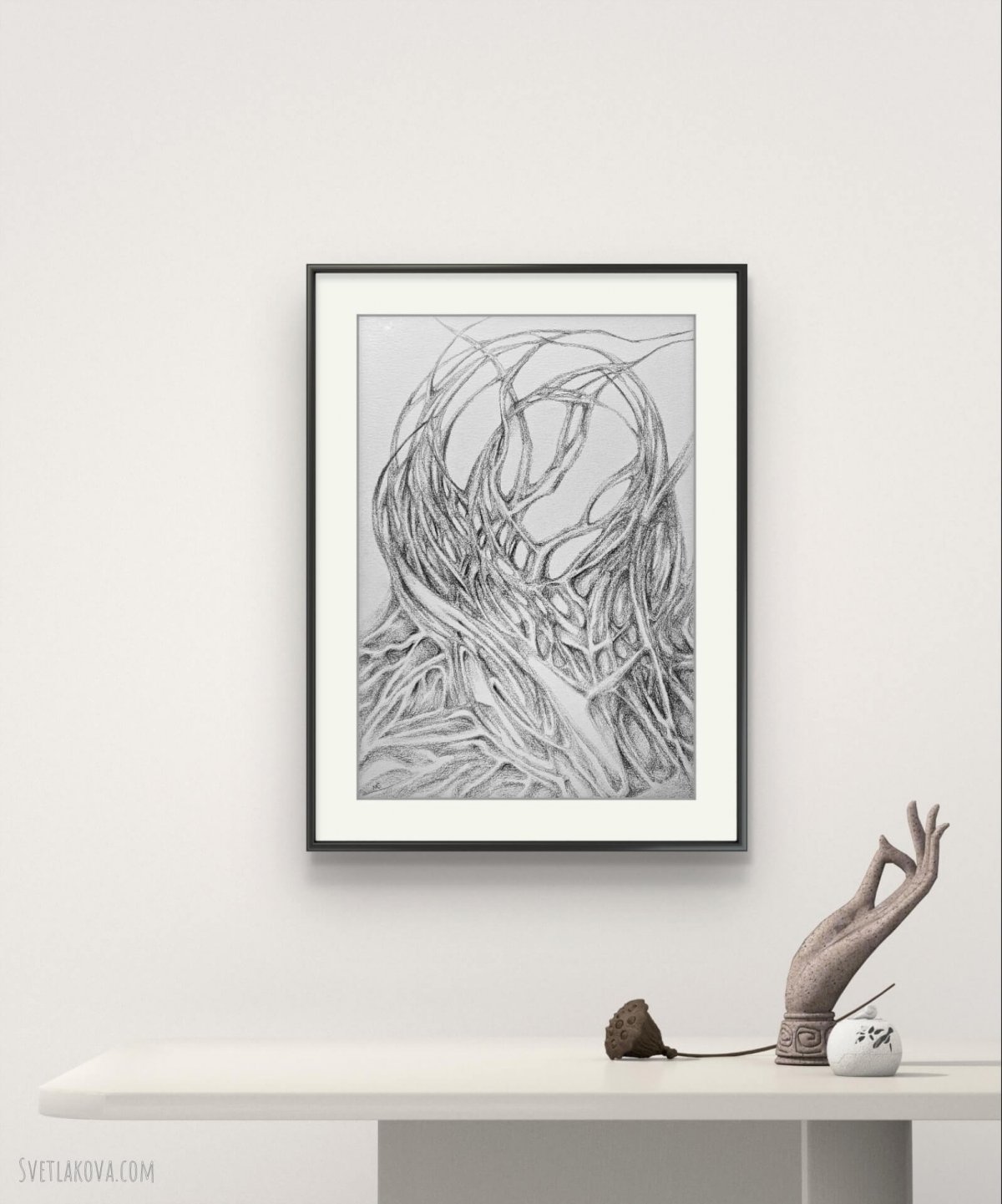 Абстрактный графический сюрреализм. Картина о тайнах зарождения вселенной и скрытых от глаз внутренних процессах бытия.