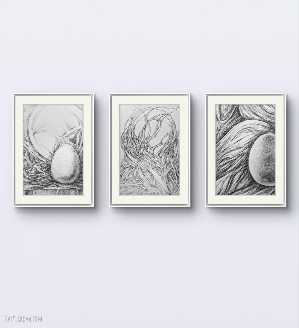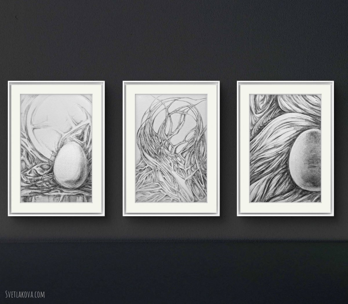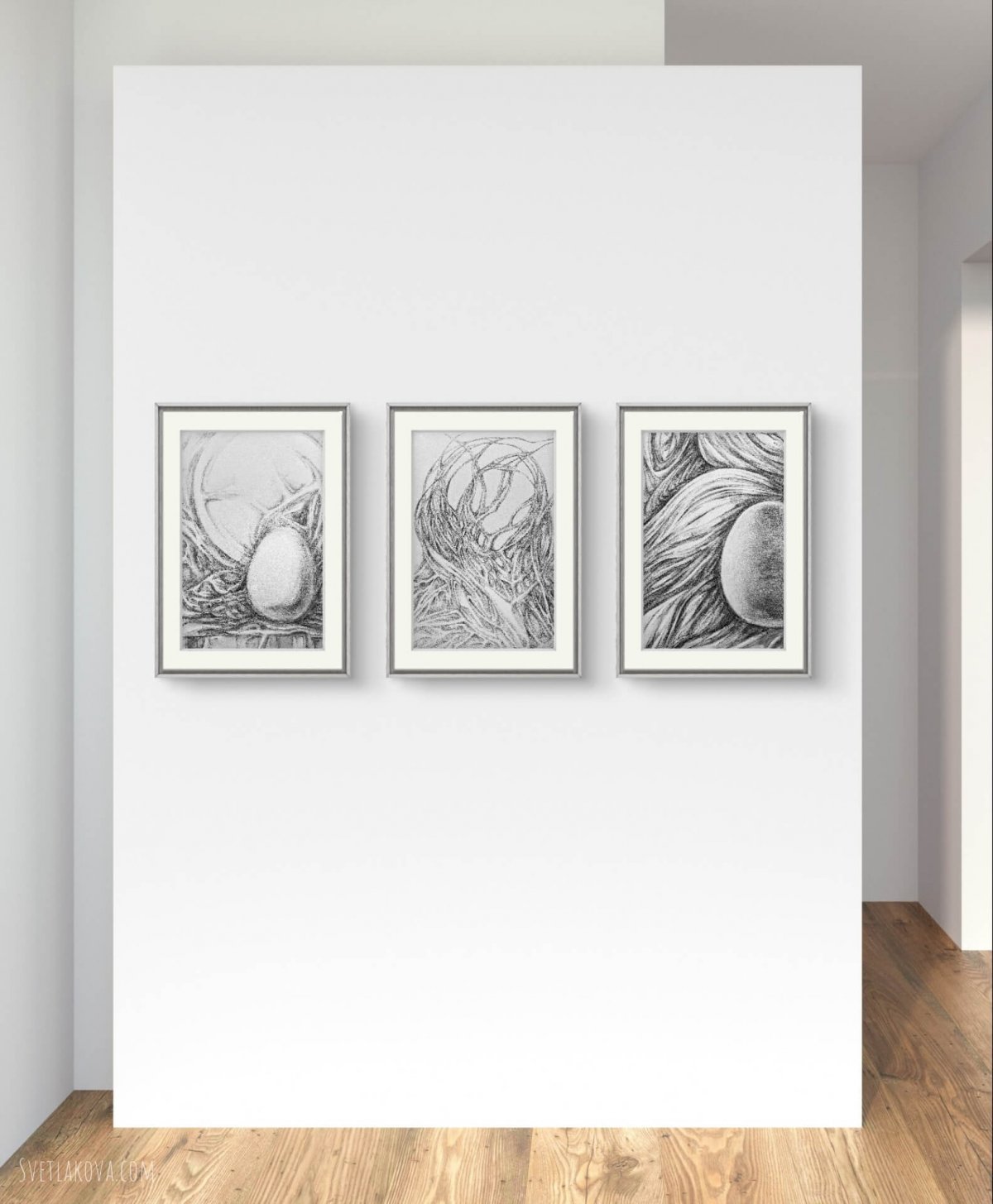 Триптих. Абстрактный графический сюрреализм. Картина о тайнах зарождения вселенной. Большой взрыв, бульон, Прото-яйцо и затмение - всё на этой планете было когда-то в первый раз.