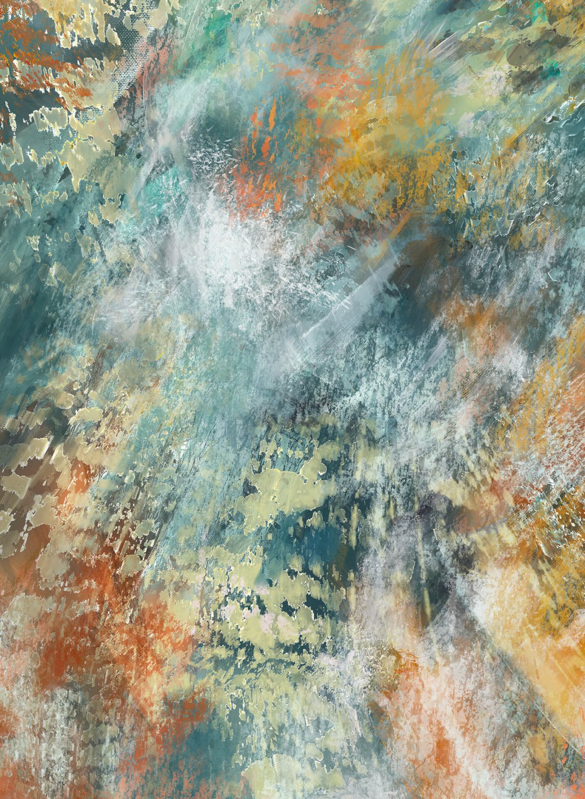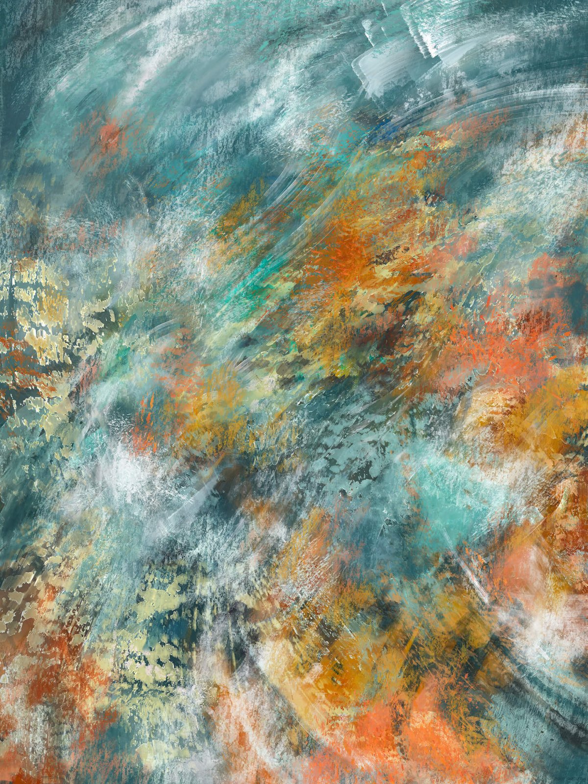 Зелено-оранжевая цифровая живопись в стиде абстрактный экспрессионизм.