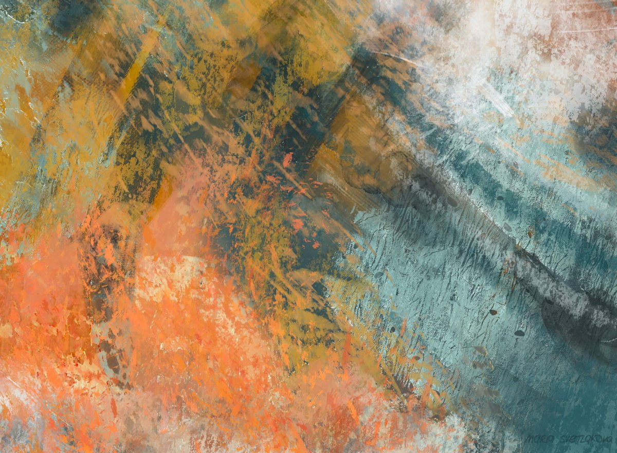 Работа создана в технике экспериментальной цифровой живописи и с применением цифровых художественных материалов, имитирующих масляные краски.