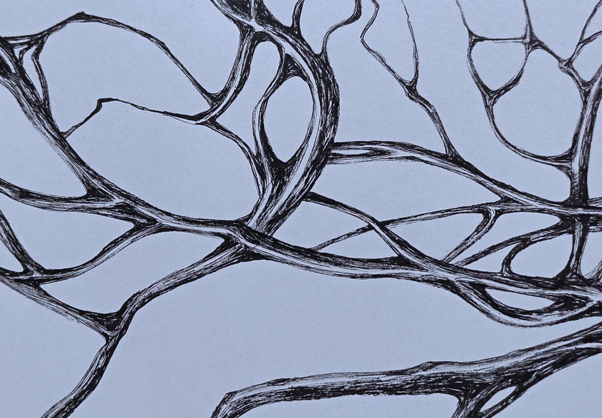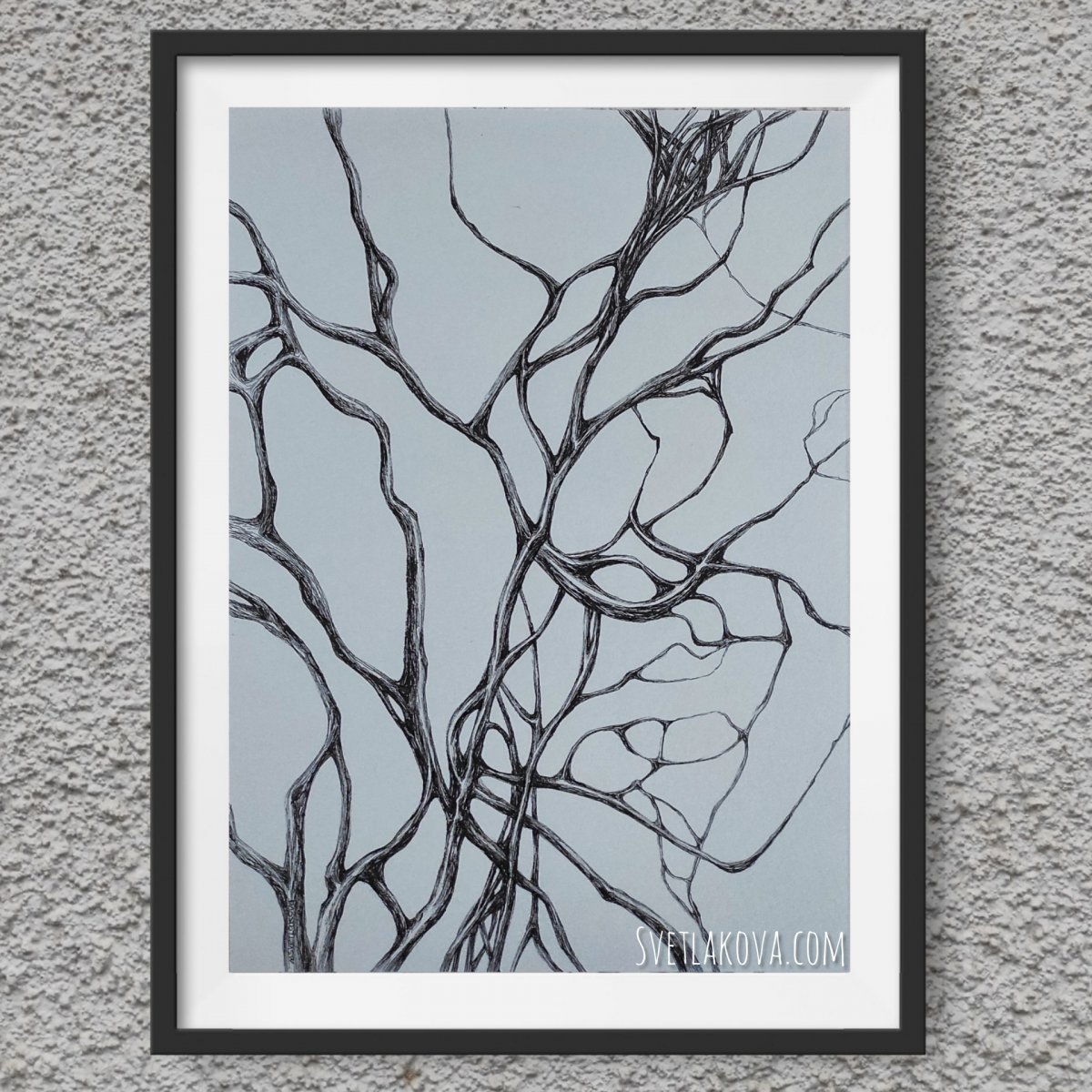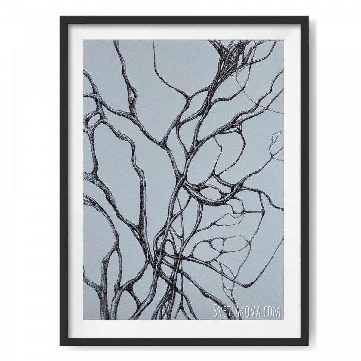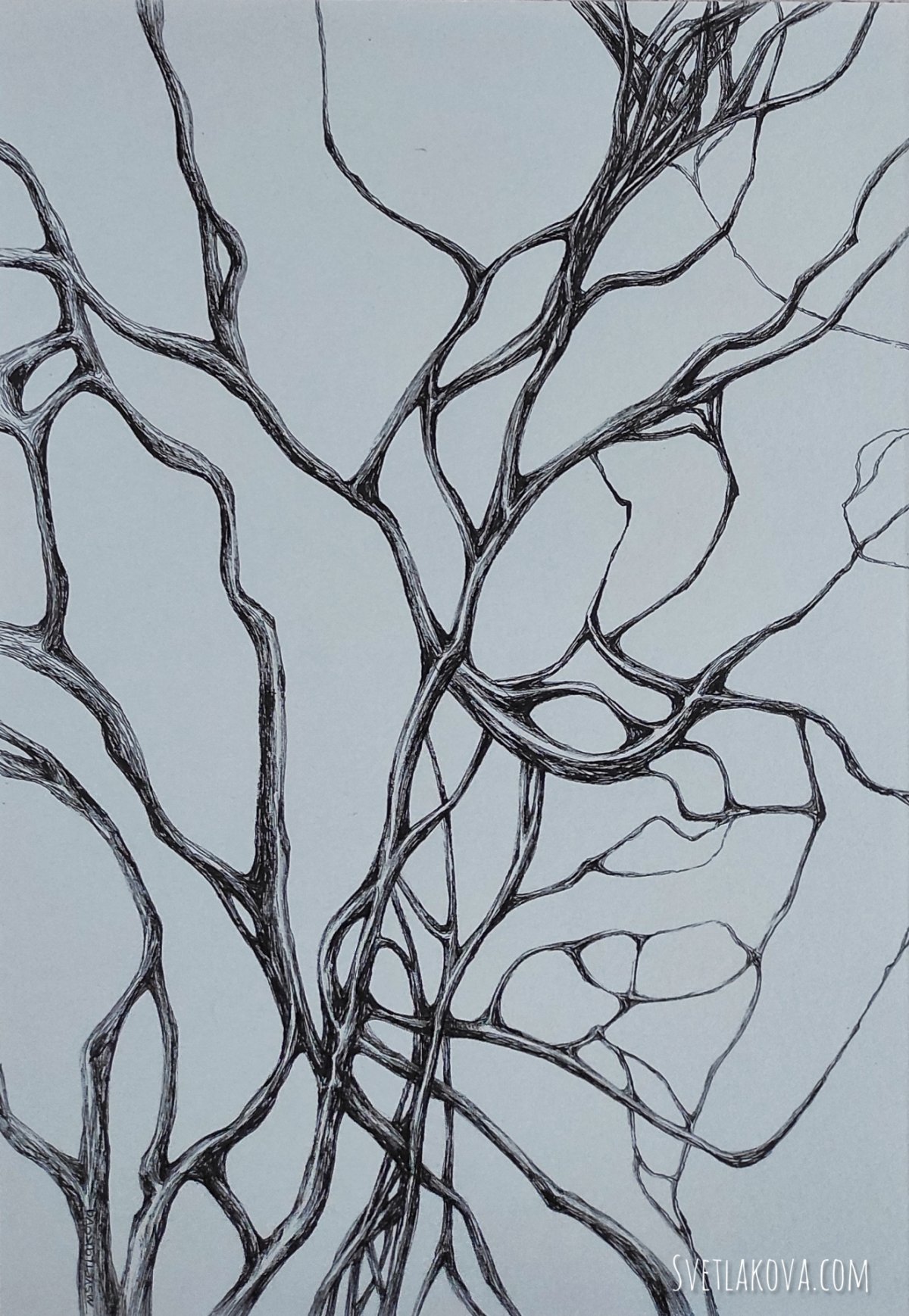 Графическая растительная абстракция изображает переплетения пут, уз и ветвей, которыми мы поросли. Картина о связях, зависимостях и причинах.