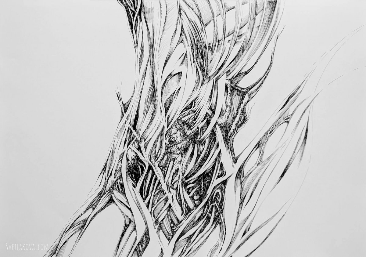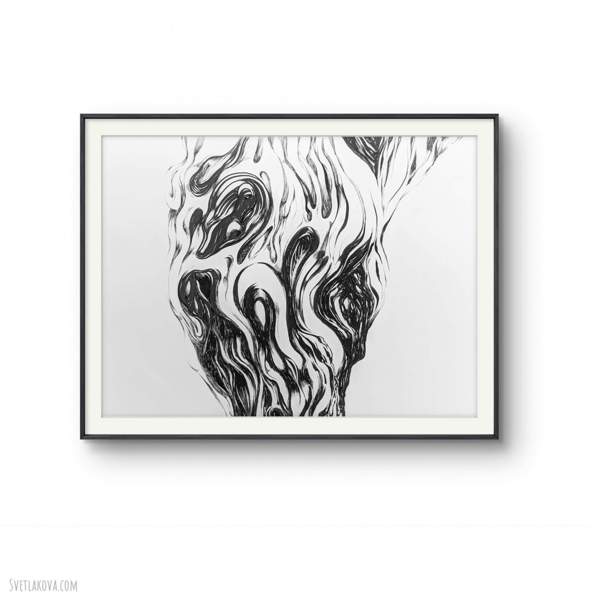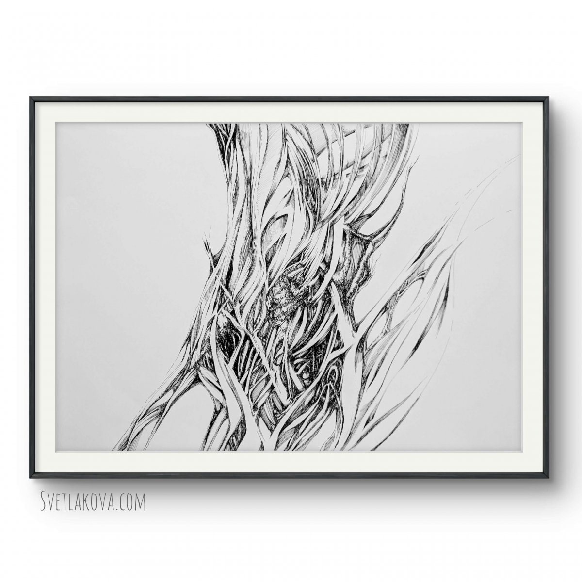 Полуабстрактная графическая композиция с биоморфными мотивами. Асиметрия и динамика линий создают ощущение движения и развития сюжета.