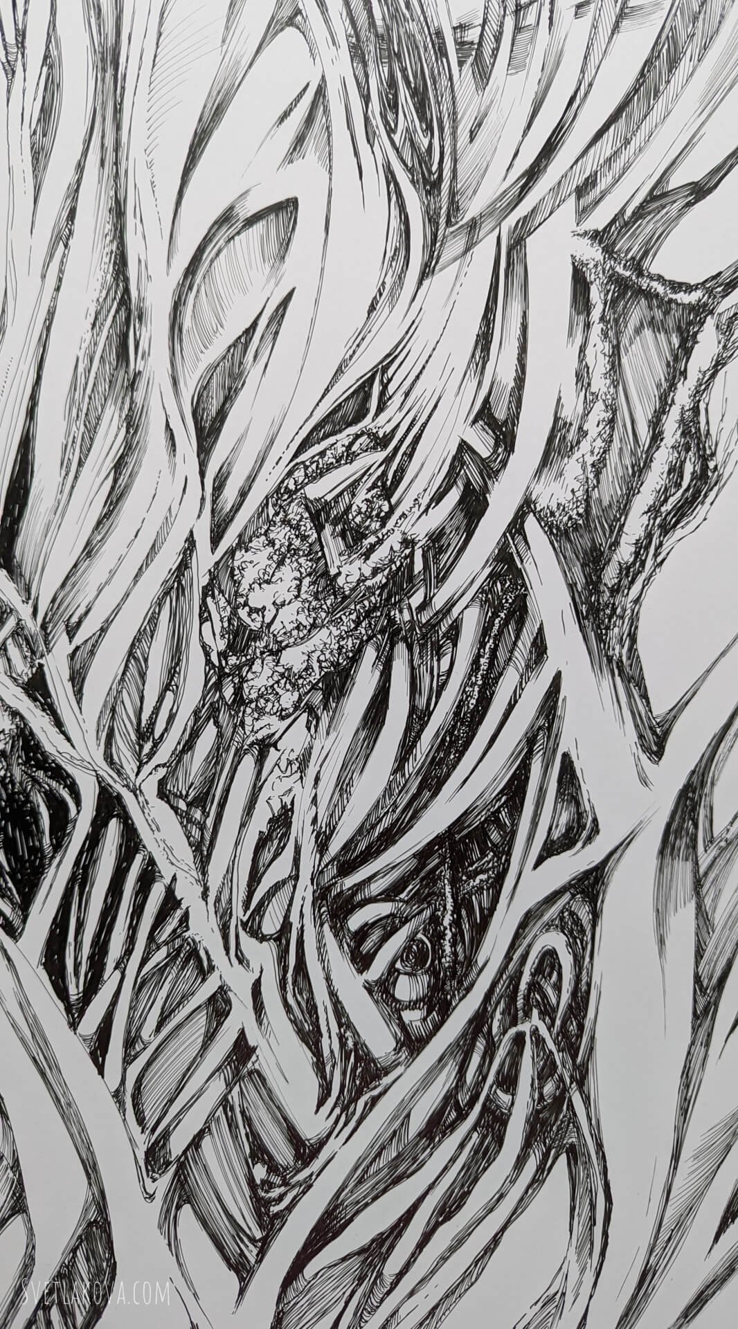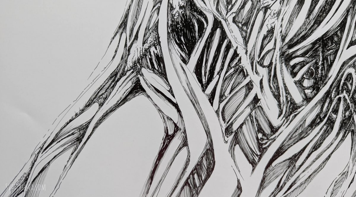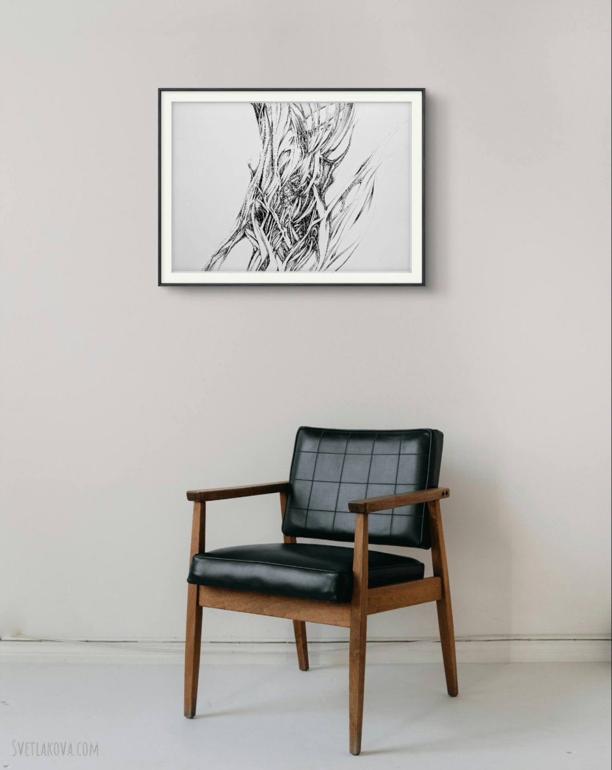 Полуабстрактная графическая композиция с биоморфными мотивами. Асиметрия и динамика линий создают ощущение движения и развития сюжета.