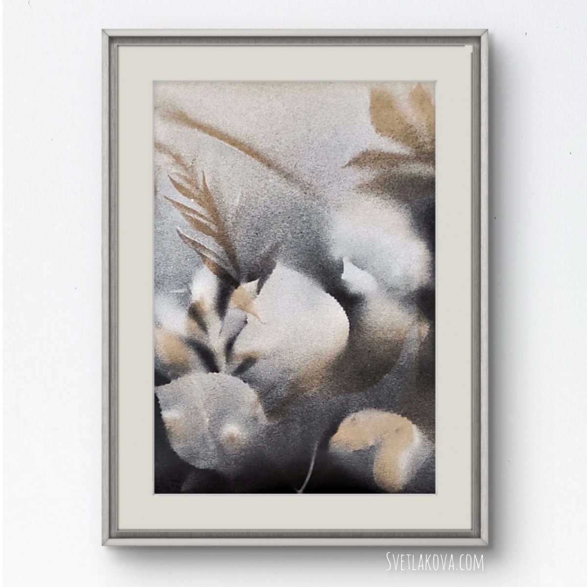 Графичные силуэты и полутени трав и цветов - как память о летних вечерах. Картина напоминает старое размытое черно-белое фото, снятое на плёнку. Настроение: романтизм, немного грусти, ощущение счастья.