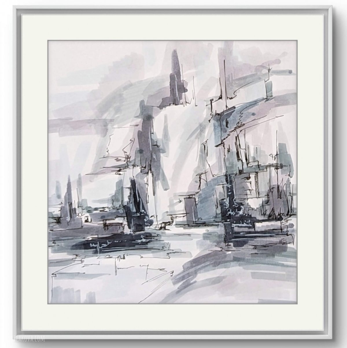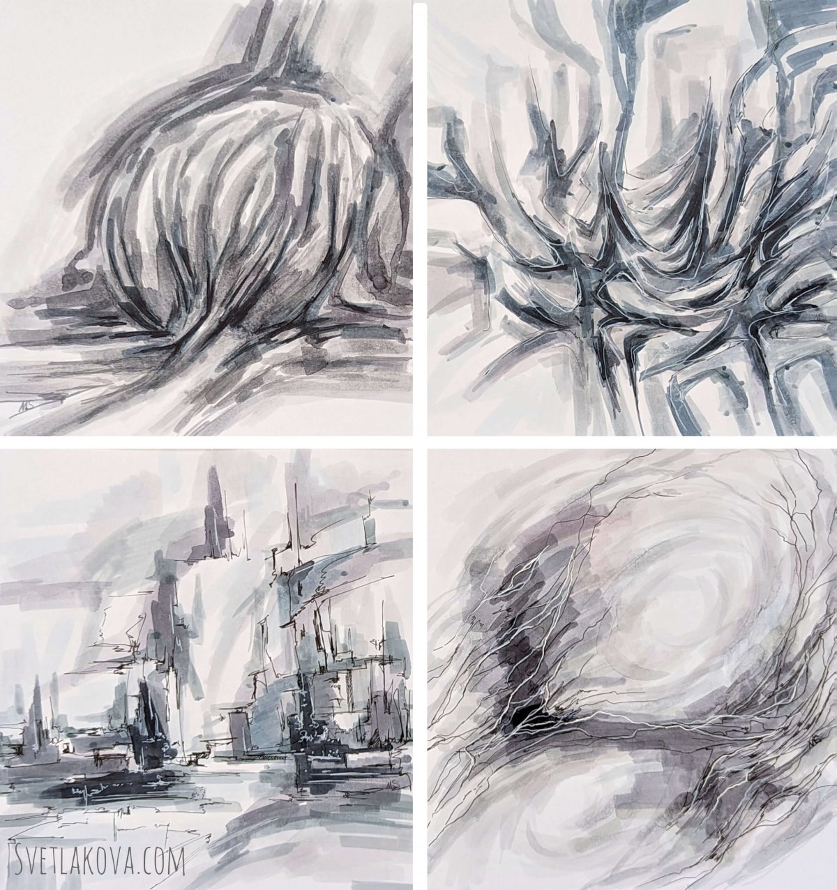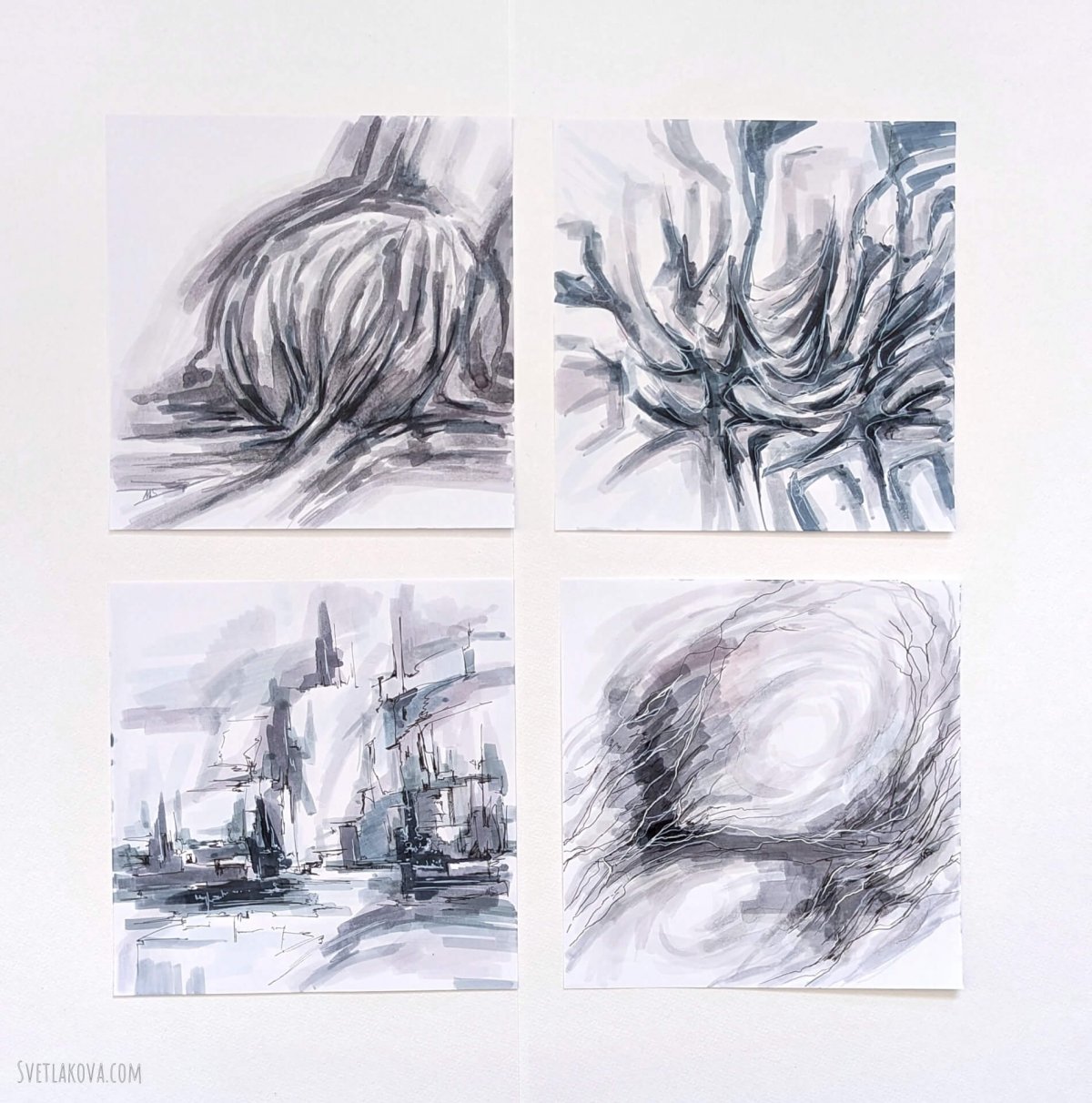 Серия из 4-х работ. Сочетание акварельных и графических эффектов в переплетении складок и объемов, а также контрасты светотени. Серия о поисках правильного пути в закоулках реальности.