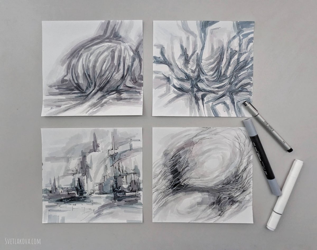 4 листа по 19,5 х 19,5 см каждый. Специальная бумага для маркеров Copic 80 г/м, маркеры.