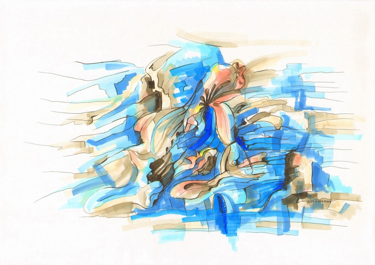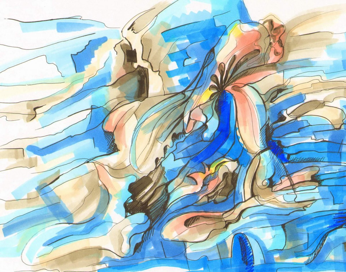 Легкая абстракция с яркими акцентами нарисована на специализированной тонкой бумаге Copic спиртовыми маркерами и чернилами.