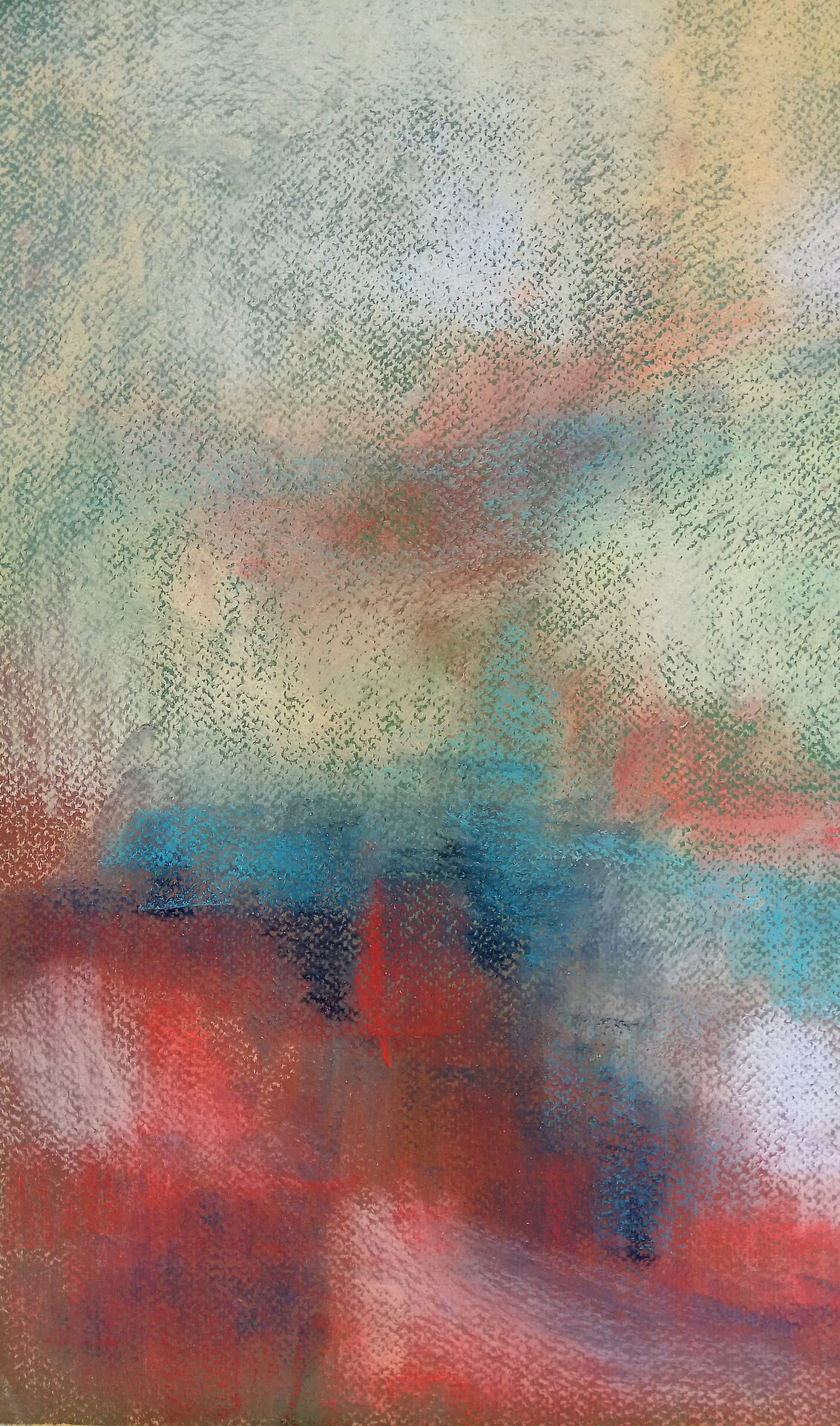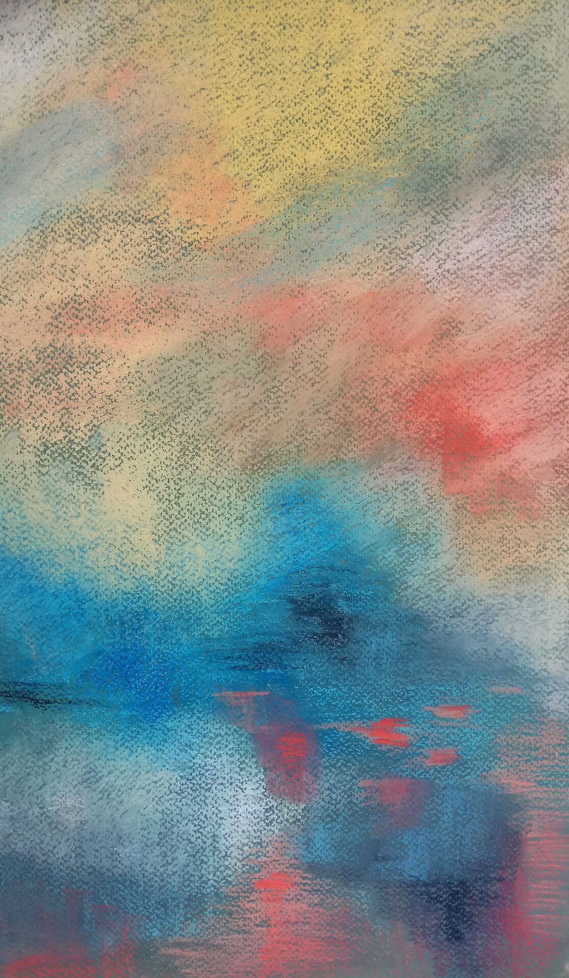 Абстрактный городской пейзаж в желто-голубых тонах на плотной цветной бумаге Fabriano, графика.